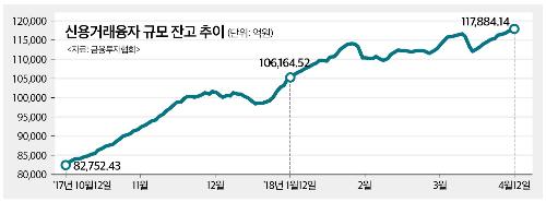 15일 금융투자협회에 따르면 지난 12일 기준 신용거래융자 잔액은 전날보다 426억2200만원 늘어난 11조7884억1400만원으로 사상 최대치를 기록했다. 지난 10일(11조6943억4100만원)과 11일(11조7457억9200만원)에 이어 사흘 연속 사상 최대치 경신이다. 직전 최대치도 불과 20여일 전인 지난달 23일 11조6799억6200만원이다.