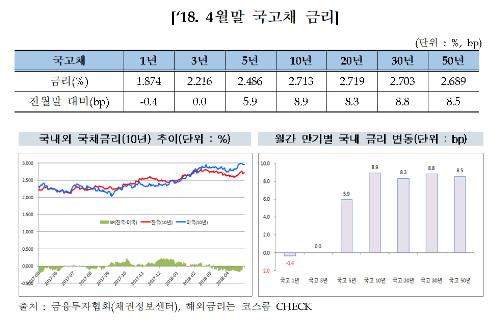 4일 금융투자협회는 이같은 내용이 담긴 '2018년 4월 장외채권시장 동향'을 발표했다. 지난 4월 미 국채금리는 5년물 24.2bp, 10년물 21.4bp, 30년물 14.9bp 상승했고, 이에 국내 국채금리 역시 5년물 5.9bp, 10년물 8.9bp, 30년물 8.8bp 동반 상승했다.