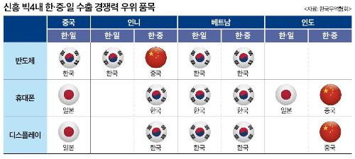 지난해 기준으로 중국에서는 한·일 간 휴대전화의 수출 경합도가 0.980로 가장 높았다. 한·일은 디스플레이(0.913), 석유제품(0.703), 선박(0.659), 기계류(0.658) 등 분야에서도 경쟁했다. 석유제품, 선박, 반도체, 화학공업제품에서는 한국이 일본보다 경쟁 우위를 점했지만, 휴대전화와 디스플레이에서는 일본이 앞섰다.