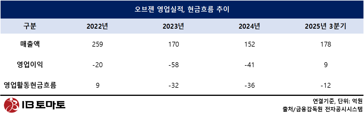 오브젠은 2023년 1월 기술성장기업 특례상장으로 코스닥에 입성한 후에도 영업실적이 개선되지 않았다. 최근 5개 회계연도 중 2022년을 제외하면 영업활동현금흐름에서 수십억원의 유출이 발생했다. 이 때문에 오브젠은 자금 조달을 위해 전환사채(CB), 유상증자 등을 활용해 왔다. CB와 관련된 파생상품평가손실이 반영되면서 3분기에는 부채비율이 398%까지 치솟았다.