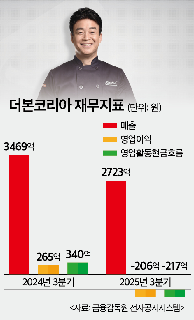 8일 금융감독원 전자공시시스템에 따르면 더본코리아의 올해 3분기 매출액은 2723억원이다. 이는 지난해 동기(3469억원) 대비 21.5% 떨어진 수치다. 영업이익도 지난해 동기(265억원) 대비 마이너스 206억원을 기록해 적자전환했다.