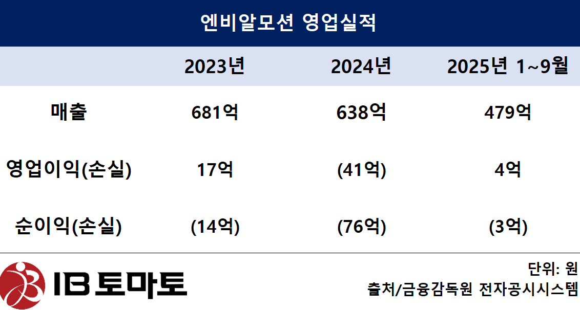 다만 실적은 아직 본격적인 성장 국면 진입 전 단계다. 엔비알모션의 지난해 1~9월 매출은 전년 동기 대비 0.6% 감소한 479억원을 기록했다. 같은 기간 영업이익은 12억원 손실에서 4억원 흑자로 전환했다. 지난해 9월 말 기준 부채비율은 162.0%로, 전년 동기(316.7%) 대비 크게 개선됐다.