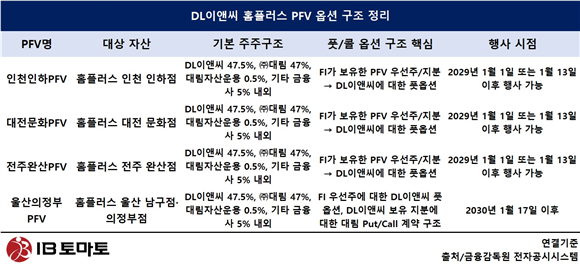해당 PFV에는 인천·대전·전주·울산 등 4개 지역 점포가 포함돼 있으며, 각 PFV의 지분 구조는 DL이앤씨 47.5%, ㈜대림 47% 수준이다. 외부 금융사의 지분 비중은 약 5% 내외에 그치며, 풋옵션 행사 가능 시점은 대부분 2029년 이후로 설정돼 있다. 울산의정부PFV의 경우에는 그룹 내부에서 지분을 조정할 수 있도록 대림과의 풋·콜옵션 계약도 함께 체결돼 있다.