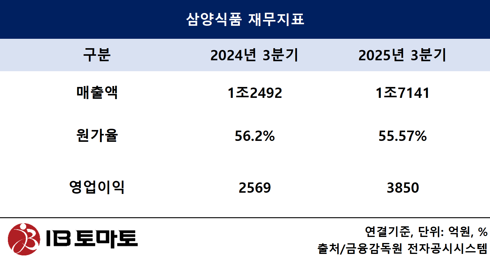삼양식품은 외형이 성장세인데다가 원가율은 하락세다. 회사의 지난해 3분기 매출액은 1조 7141억원으로, 전년 동기 1조 2492억원을 기록해 37.22% 올랐다. 반면 지난해 3분기 원가율은 55.57%으로 전년 동기 56.2%보다 줄었다. 특히 주요 원재료인 맥분 가격을 살펴보면, 키로당 2023년 887원, 2024년 782원, 2025년 3분기 741원을 기록해 3년새 16.46%가 하락했다.