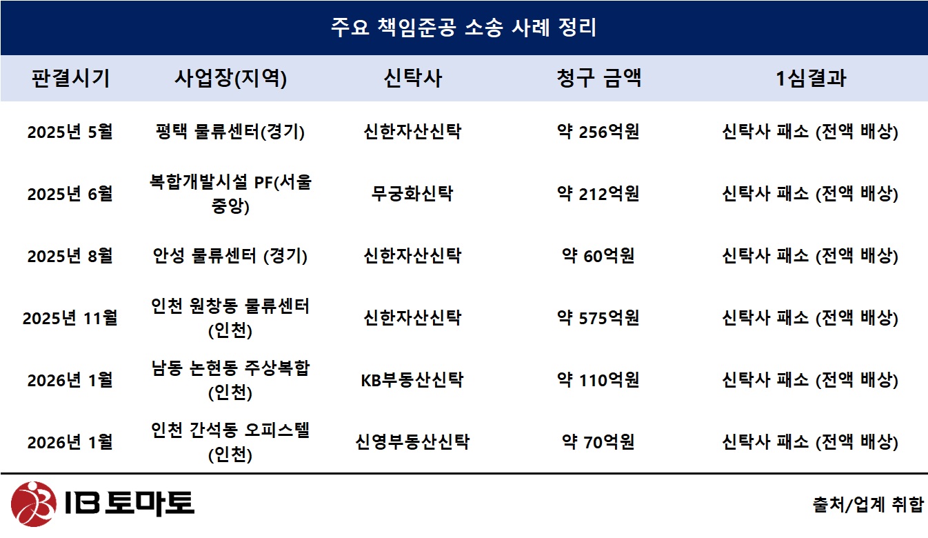 최근 1~2년 사이 책임준공을 둘러싼 주요 소송들을 살펴보면, 먼저 2025년 5월 평택 물류센터 사건을 시작으로 2026년 1월 인천 간석동 오피스텔 사건까지 이어졌으며, 현재까지 선고된 1심 판결은 모두 신탁사 패소로 귀결된 것으로 나타났다. 물류센터·주상복합·오피스텔 등 사업 유형과 지역을 가리지 않고 법원은 책임준공 기한을 넘긴 경우 대출 원리금 전액 배상 책임을 인정했다. 금융지주 계열 신탁사들(신한(005450)·KB) 뿐 아니라 비상장 신탁사(무궁화, 신영 등)까지 전방위적으로 같은 법리가 적용되면서, 책임준공 확약은 더 이상 형식적 신용보강 장치가 아니라 사실상 상환 의무에 준하는 계약 구조로 해석되는 흐름이 굳어지는 모습이다.