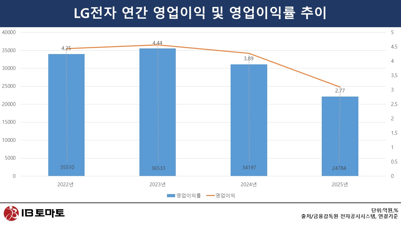 LG전자의 연결 기준 영업이익률은 2022년 4.25%에서 2023년 4.44%로 소폭 개선됐지만 2024년 3.89%로 하락한 데 이어 지난해에는 2.77%까지 낮아졌다. 전통 가전 부문의 성장 둔화와 비용 부담이 겹치면서 전반적인 수익성이 제약을 받고 있는 상황이다. 결국 로봇을 포함한 신사업에서 의미 있는 성과를 내지 못할 경우 수익성 반등 동력도 제한될 수밖에 없다는 분석이 나온다.