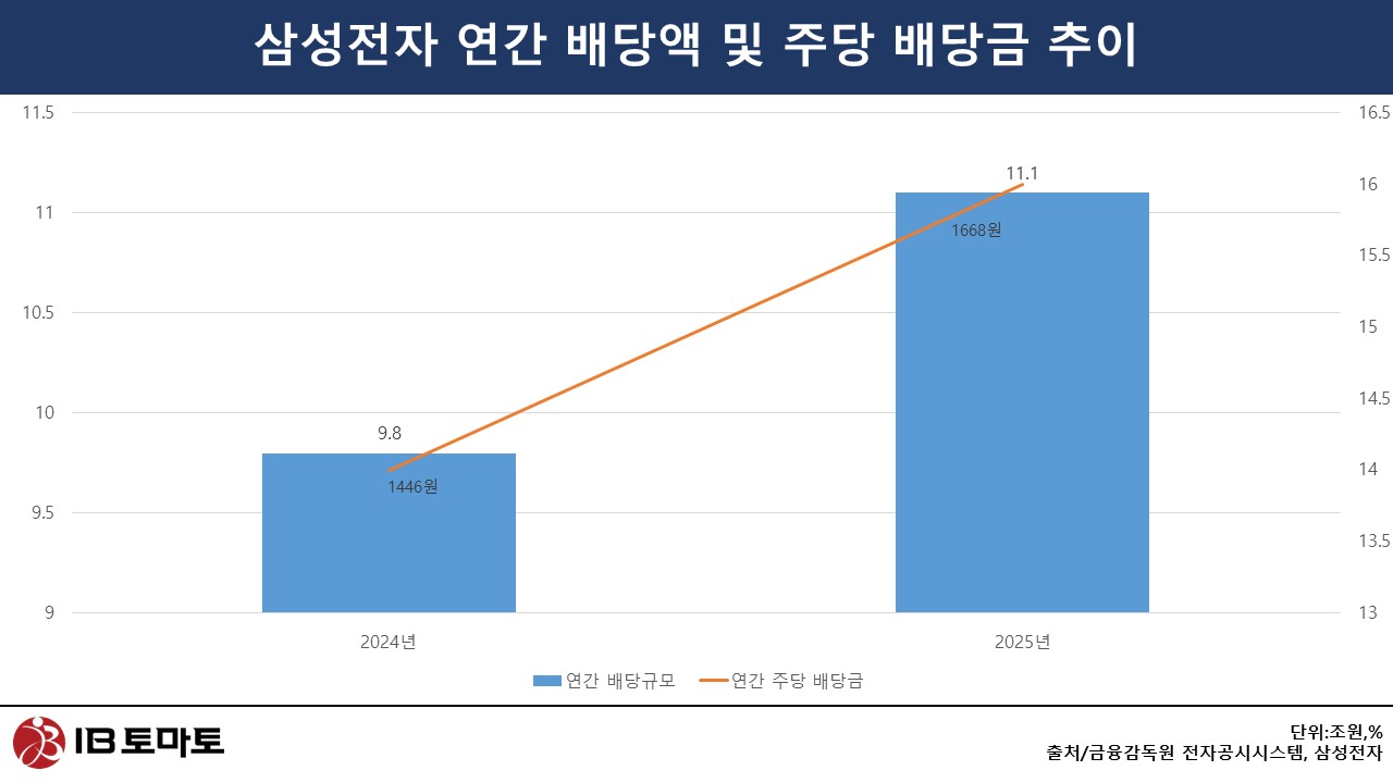 삼성전자도 특별배당 카드를 꺼냈다. 삼성전자는 1조 3000억원 규모의 지난해 4분기 결산 특별배당을 실시할 예정이다. 2020년 4분기(10조 7000억원) 특별배당 이후 5년 만이다. 기존 분기 배당(2조 4500억원)에 특별배당이 더해지면서 연간 총 배당은 11조 1000억원으로 확대됐다. 직전년도인 9조 8000억원 대비 1조 3000억원 증가한 수준이다. 연간 주당 배당금 또한 1446원에서 1668원으로 15.3% 늘었다.