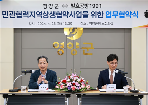 오도창 영양군수(왼쪽)와 이동훈 발효공방1991 대표이사가 '민관협력 지역상생 협약사업' 추진을 위한 업무협약을 체결하고 있다.(사진=교촌에프앤비)