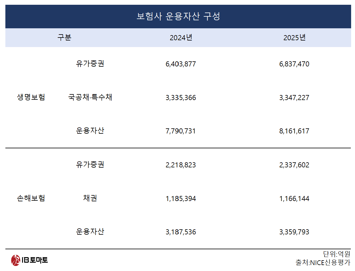 9일 NICE신용평가 통계 자료, 금융통계정보시스템에 따르면 지난해 말 기준 생명보험 업권은 전체 운용자산 816조1617억원에서 41.0%(334조7227억원)가 국공채와 특수채로 구성됐다. 같은 기간 손해보험은 운용자산 335조9793억원 중 34.7%(116조6144억원)가 채권이었다.