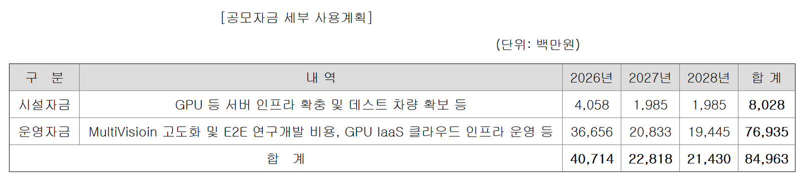 스트라드비젼은 이번 공모를 통해 사업 인프라 및 R&D 확대에 박차를 가한다는 구상이다. 회사는 조달 자금을 ▲그래픽처리장치(GPU) 등 서버 인프라 확충 ▲멀티비젼(MultiVision) 고도화 ▲GPU 서비스형인프라(IaaS) 클라우드 인프라 운영 등으로 사용한다는 계획을 밝혔다.