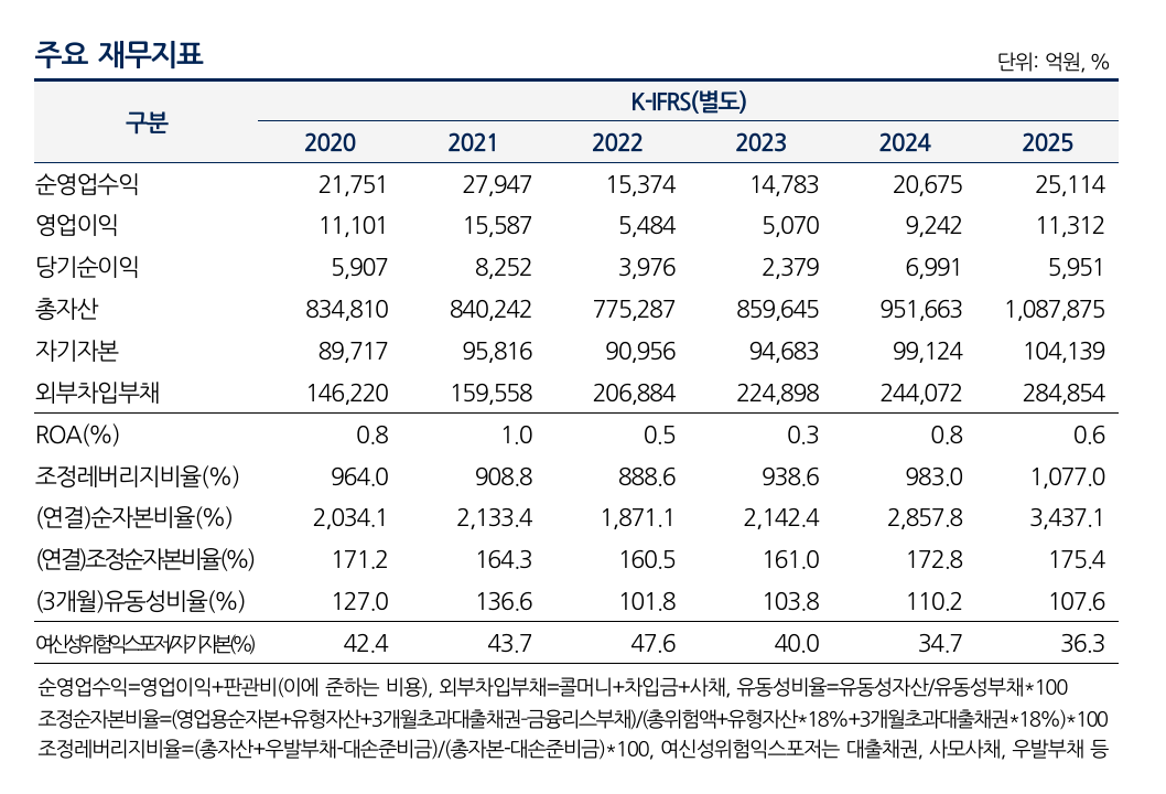 유동성 측면에서도 안정적인 모습을 보인다. 다양한 조달 수단과 우수한 대외 신인도를 바탕으로 자금 대응력이 확보됐다. 발행어음 등 조달원 다변화 역시 긍정적 요인이다. 다만 단기 조달과 장기 운영 간 만기 불일치에 따른 유동성 변동성은 지속적인 관리가 필요할 것으로 분석된다.