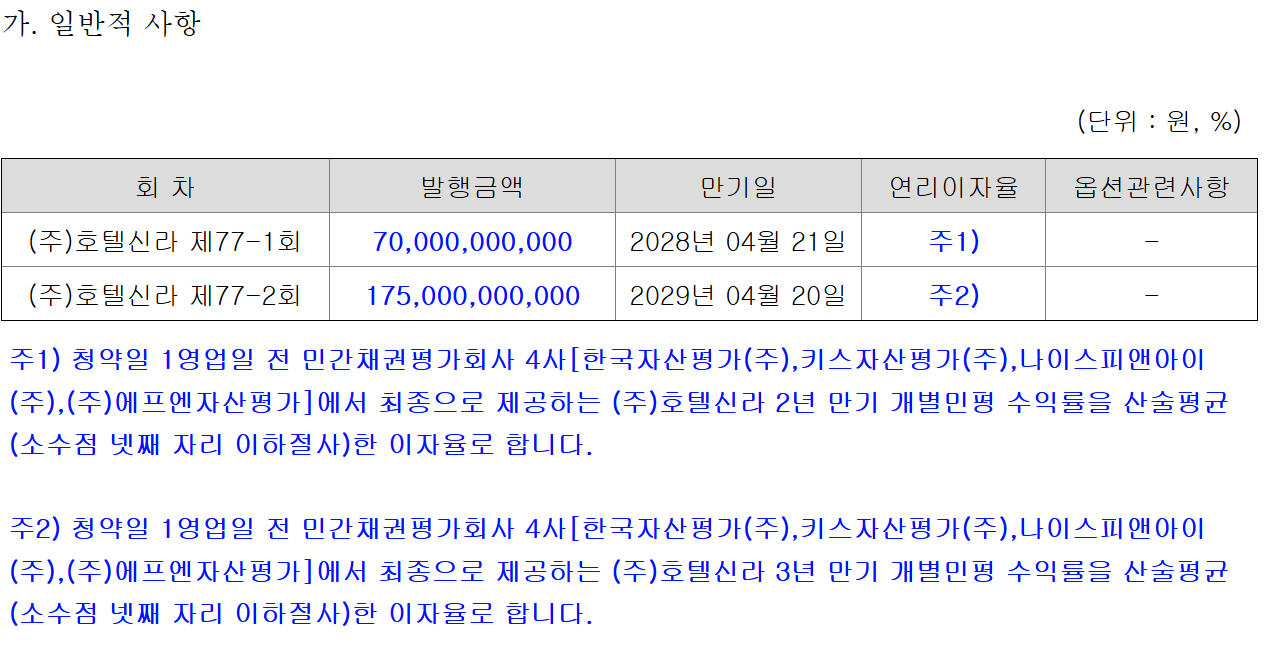 이자율은 청약일 1영업일 전 민간채권평가회사 4사(한국자산평가, 키스자산평가, 나이스피앤아이, 에프앤자산평가)에서 최종으로 제공하는 호텔신라 2년, 3년 만기 회사채 개별민평수익률을 산술평균한 이자율로 한다. 청약기일은 오는 22일이다.