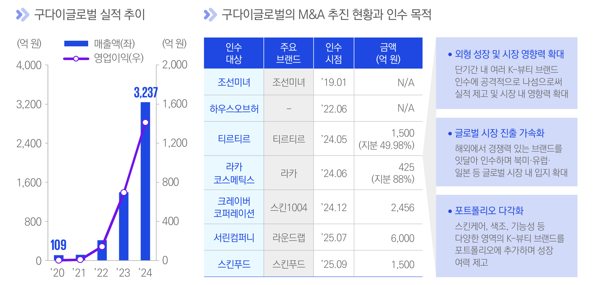 구다이글로벌은 2016년 화장품 총판업체로 시작해 2019년 조선미녀를 인수하며 외형 확대의 발판을 마련했다. 이후 국내외 뷰티 브랜드를 잇달아 편입하며 몸집을 키웠다. 2023년에는 하우스오브허코리아와 내일모레글피 지분을 인수했고, 2024년에는 포포리너, 아이유닉, 크레이버코퍼레이션을 품었다. 지난해에는 티르티르, 스킨푸드, 서린컴퍼니, 닥터나인틴 지분을 인수하며 외형 성장을 이어갔다.