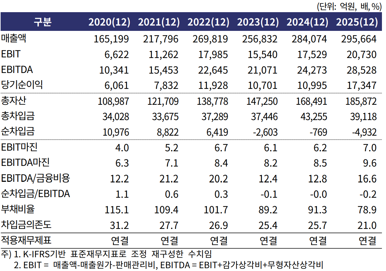 최정현 한국기업평가 선임연구원은 "계열 물량과 해운사업 등 우수한 사업역량에 기반한 안정적인 영업현금창출력을 바탕으로 향후 투자 확대에도 우수한 재무안정성을 유지할 것으로 전망된다"라며 "투자가 집중되는 시기에 일시적으로 차입규모가 증가할 수 있겠으나, 중장기적으로 투자 성과가 발현됨에 따라 안정적인 수준을 유지할 것으로 예상된다"라고 말했다.