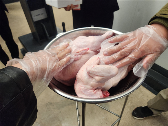 하림은 이와 달리 '가스 스터닝(Gas Stunning)' 방식을 적용하고 있다. 닭이 가스를 흡입해 잠든 상태에서 경동맥을 순간적으로 절단하는 방식이다. 스트레스를 줄이면서 모세혈관 속 혈액까지 효과적으로 제거할 수 있다는 게 회사 측 설명이다. 해당 공정은 닭의 스트레스를 최소화하기 위해 암전 상태에서 진행된다. 투어를 위해 내부 조명이 잠시 켜지자 도계 라인은 예상보다 조용하고 정돈된 모습이었다. 이후 닭은 뜨거운 물을 거쳐 깃털이 제거되고, 섬세한 전기 자극인 스티뮬레이션 과정을 통해 육질을 부드럽게 만드는 단계로 넘어간다.