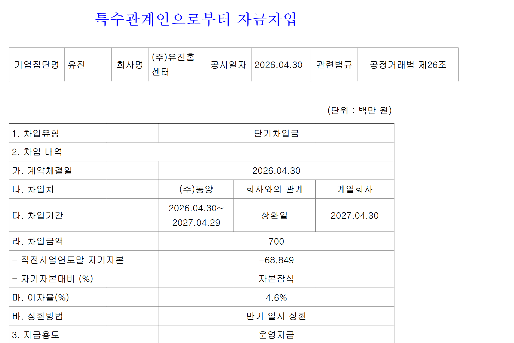 동양(001520)으로부터 7억원의 단기차입금을 차입했다. 차입기간은 이날부터 2027년 4월29일까지며, 상환일은 2027년 4월30일까지다. 유진홈센터의 직전사업연도말 자기자본은 마이너스 688억원으로 자본잠식 상태다. 이자율은 4.6%, 운영 자금 용도로 차입한다. 이는 유진홈센터가 자기자본이 마이너스인 자본잠식 상태에서 계열사로부터 운영자금을 차입해 단기 유동성을 보강한 것으로 보인다.