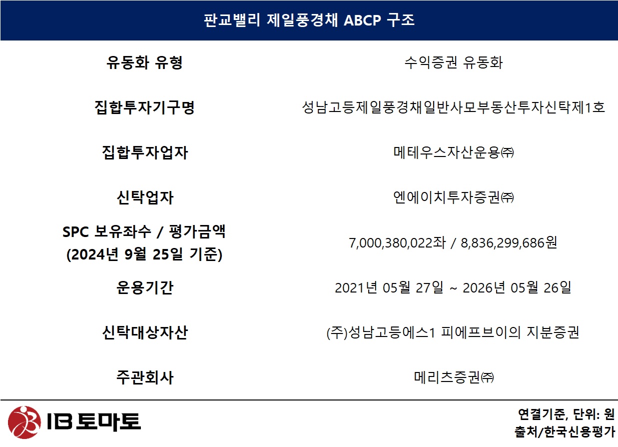 판교밸리 제일풍경채가 논란의 중심에 선 이유는, 이 단지가 더 이상 단순한 주거공급이 아니라 '금융 상품화된 자산'으로 기능하고 있기 때문이다. 한국신용평가에 따르면 현재 단지 지분은 메테우스자산운용이 운용하는 부동산투자신탁에 편입돼 있으며, 이 펀드 수익증권을 기초로 SPC(에스코퍼제일차)가 ABCP 등 유동화증권을 발행하고 있다. 과거에는 시행사가 PFV 지분을 통해 단지를 직접 보유했다면, 지금은 투자자가 펀드 지분을 나눠 보유하는 구조로 전환된 것이다.