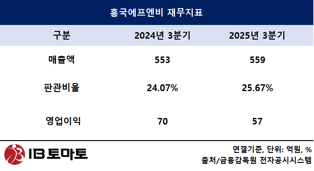 3일 금융감독원 전자공시시스템에 따르면 흥국에프엔비의 지난해 3분기 매출액은 누적기준 559억원으로 전년 동기 553억원 대비 1.08% 늘었다. 외형은 커졌지만 늘어난 판관비율로 영업이익은 줄었다. 지난해 3분기 핀관비율은 25.67%로 전년 동기 24.07% 늘었다. 이에 영업이익도 지난해 3분기 57억원으로 전년 동기 70억원 대비 18.57% 감소했다.