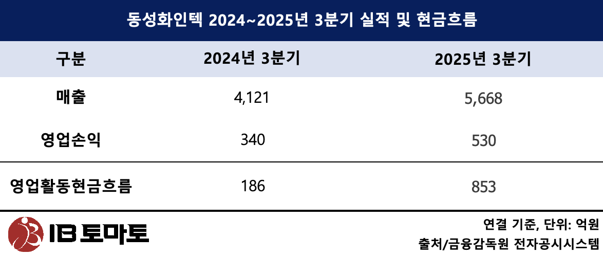 풍부한 선수금 유입은 현금흐름을 크게 개선했다. 동성화인텍의 3분기 영업활동현금흐름은 853억원을 기록, 이는 전년 동기 186억원이었던 것과 비교하면 무려 4.6배가량 폭증한 수준이다.