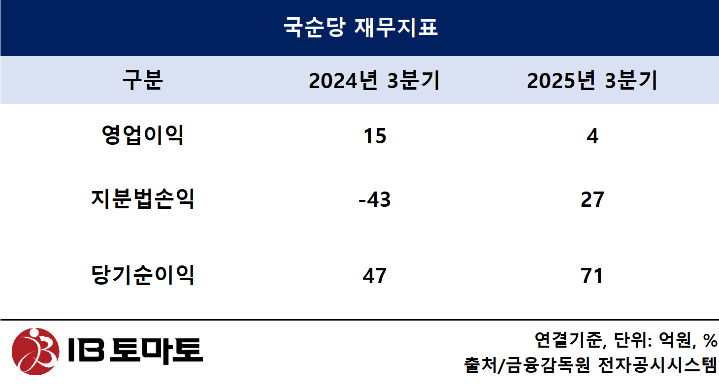 영업이익이 크게 하락했지만 당기순이익은 오히려 47억원에서 71억원으로 51.06% 늘었다. 이는 지분법손익이 2024년 3분기 마이너스 43억원에서 2025년 27억원으로 흑자전환한 영향이 큰 것으로 풀이된다.