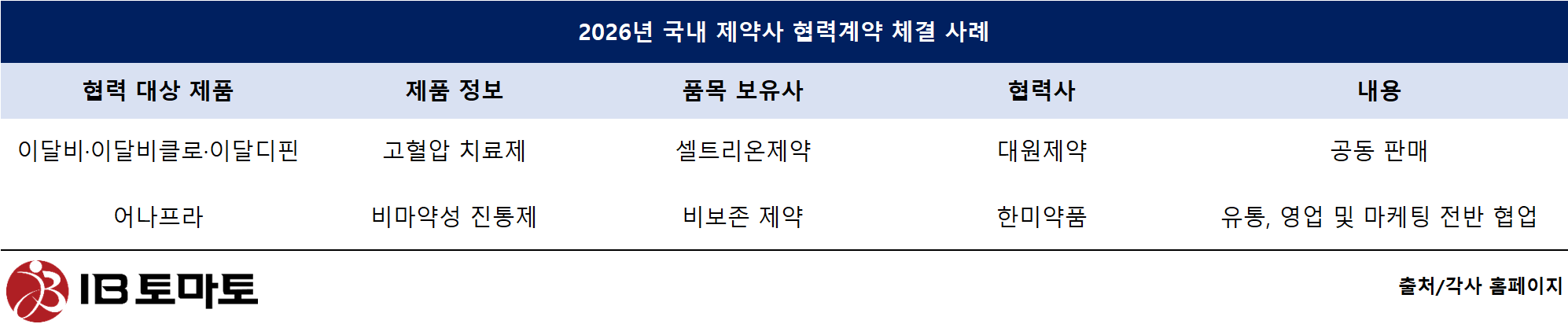 9일 업계에 따르면 2026년 연초부터 새롭게 체결된 국내 제약사 간 협업 소식이 들려오고 있다. 먼저 대원제약(003220)이 1월6일 셀트리온제약(068760)의 고혈압치료제 '이달비', '이달비클로', '이달디핀' 3종에 대한 국내 공동 판매 계약을 체결하고 본격적인 판매에 돌입한다고 밝히며 그 포문을 열었다.