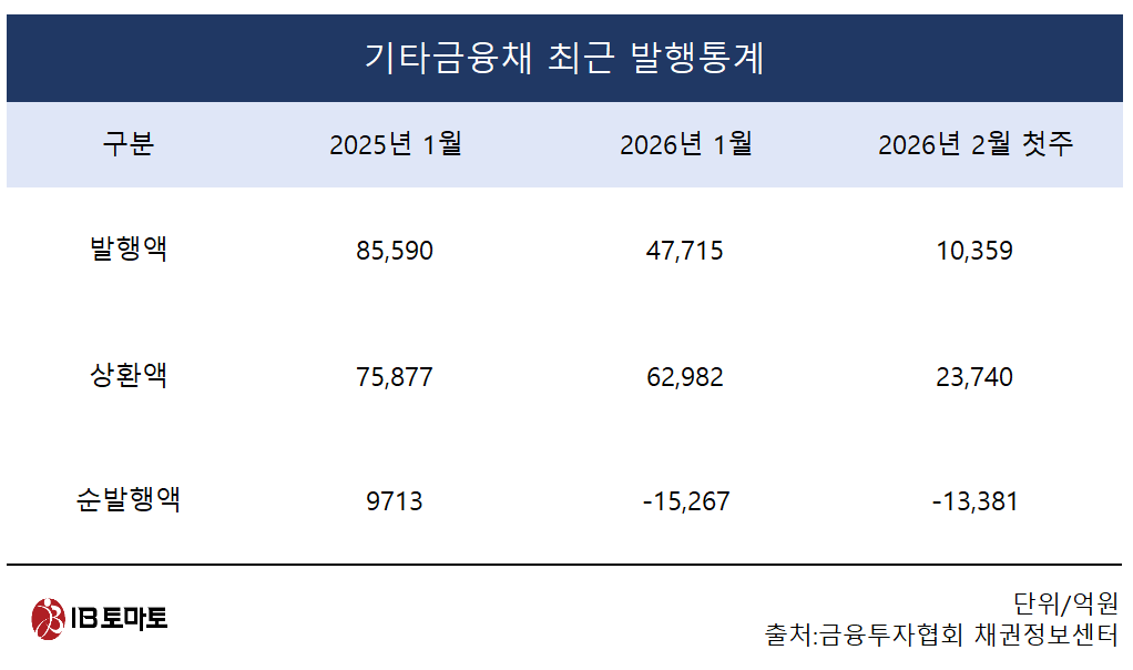 11일 금융투자협회 채권정보센터에 따르면 기타금융채는 지난달 순상환했다. 채권 발행액이 4조7715억원인 반면 상환액이 6조2982억원으로 훨씬 커 순발행액(-1조5267억원)이 대규모 마이너스 수치를 기록했다. 채권을 새로 펴내기보다는 기존 것을 갚는 데 집중했다는 뜻이다.