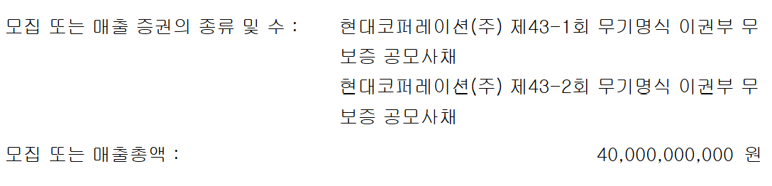 공모희망금리는 청약일로부터 1영업일 전 민간채권평가회사 4사(한국자산평가·키스자산평가·나이스피앤아이·에프앤자산평가)에서 최종 제공하는 현대코퍼레이션 회사채 개별민평 수익률의 산술평균에 마이너스(-) 0.50%포인트(P)~+0.30%P를 가산한 이자율로 한다.