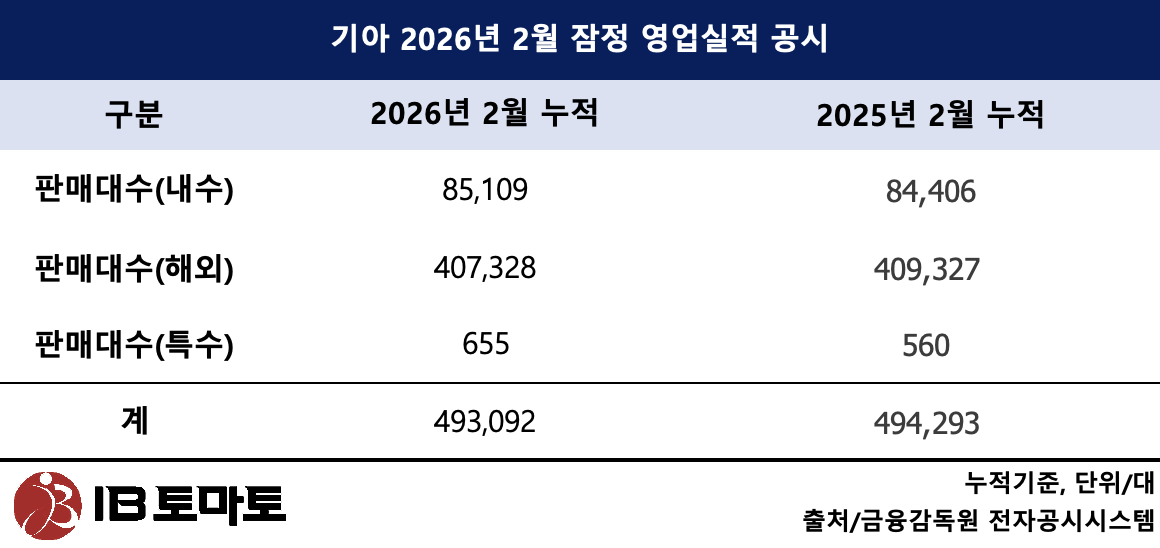 국내 실적 역시 주목할 만하다. 2월 한 달간 기아는 전기차 부문에서만 1만 4488대를 판매하며 창사 이래 최초로 월간 전기차 판매 1만대 시대를 열었다. 설 연휴로 인한 영업일수 감소에도 불구하고 PBV 모델인 PV5가 3967대, EV3가 3469대 판매되는 등 친환경차 라인업이 실적을 견인했다.