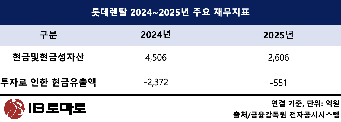 이 같은 자산 표류는 롯데렌탈의 최근 악화된 재무흐름과 맞물려 우려를 더하고 있다. 롯데렌탈의 지난해 말 기준 현금및현금성자산은 2606억원으로 집계됐다. 이는 전년도인 2024년 말 기준 4506억원과 비교했을 때 1년 만에 42.2%나 급감한 수치다. 영업활동을 통한 현금창출력과는 별개로 가용 가능한 보유현금이 절반 가까이 줄어든 상황에서 661억원이라는 자금이 법적 분쟁으로 묶인 점은 유동성 관리 측면에서 회사에 적지 않은 부담으로 작용하고 있다.