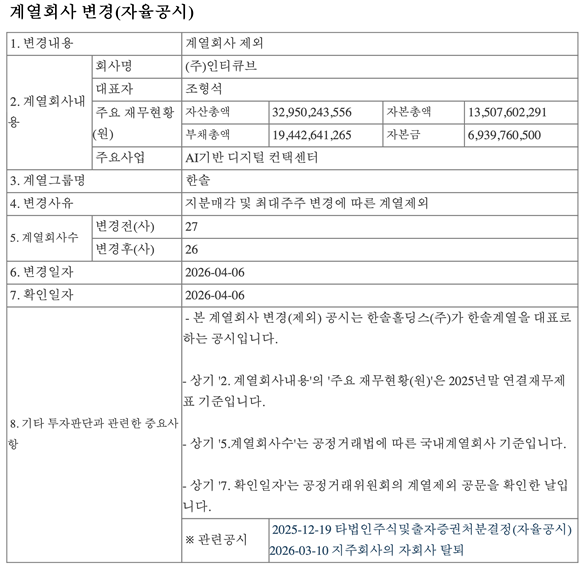 [IB토마토 정준우 기자] 지난해 기준 재계 순위 86위 한솔그룹이 계열사 인티큐브 지분을 전량 매각해 계열사에서 제외했다. 계열 제외 과정에서 이사회의 지분 매각 결정, 실제 지분 매각 행위, 매각 사후 공정위 공문 수령 공시 등 총 3건의 공시가 공개됐다.