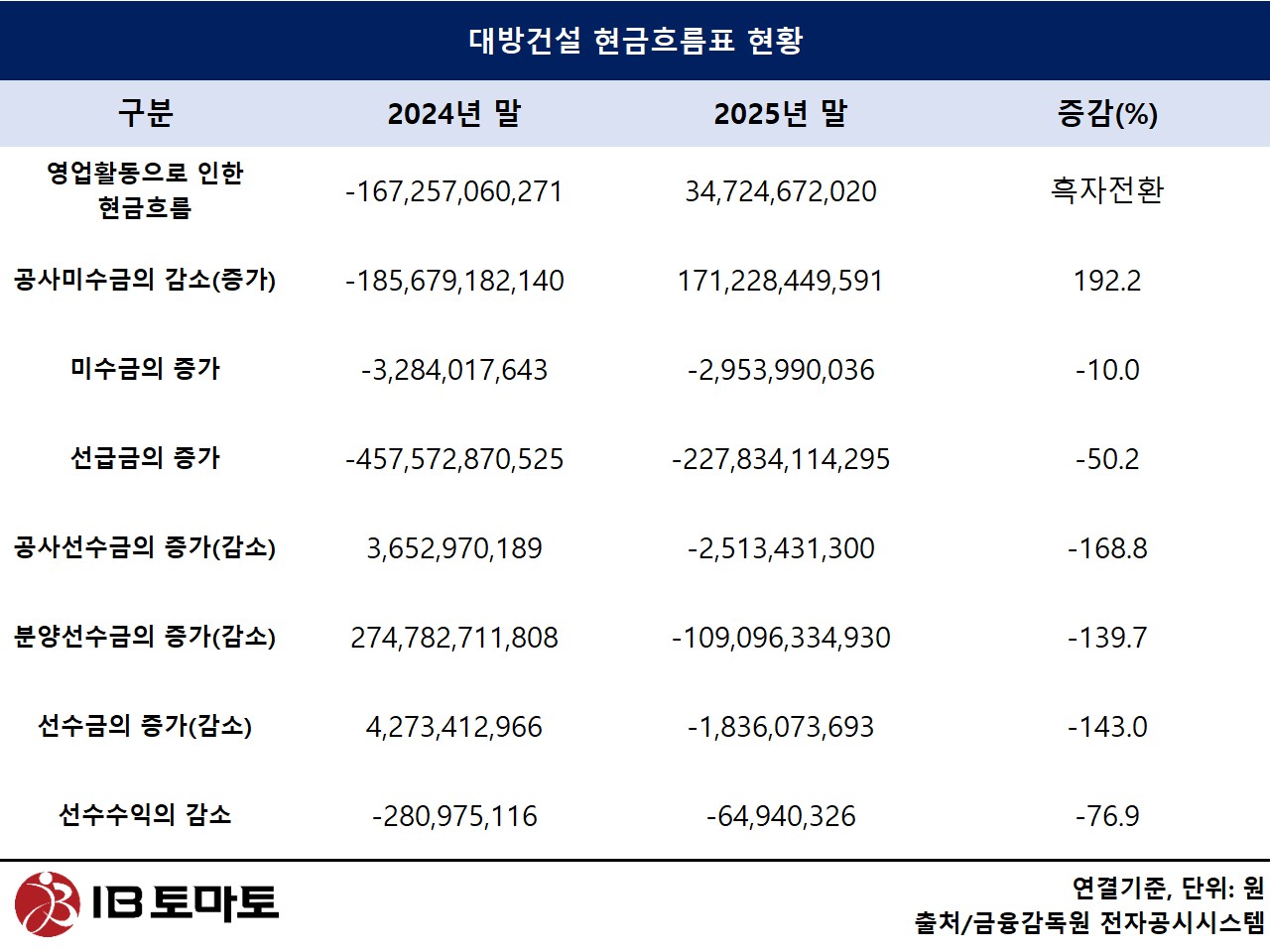 대방건설 관계자는 <IB토마토>와의 통화에서 "올해 영업활동 현금흐름이 흑자로 전환된 것은 공사미수금 회수 영향이 컸다"며 "이번에 미수금이 줄어들면서 전반적으로 현금 유입이 개선됐다"고 설명했다. 이어 "일시적인 효과라기보다 향후에도 영업 활동을 통해 안정적인 현금 창출이 가능한 기반이 마련된 것으로 보고 있다"고 덧붙였다.