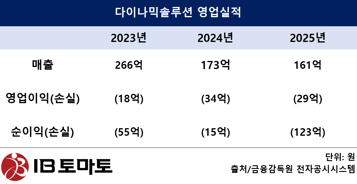 14일 금융감독원 전자공시시스템에 따르면 다이나믹솔루션의 지난해 매출은 161억원으로 전년 동기 대비 7.1% 감소했다. 지난 2023년 매출은 266억원으로 2년 새 매출이 39.8% 쪼그라든 상황이다. 지난해 영업손실은 29억원으로 최근 3년 연속 적자를 기록한 것으로 파악됐다. 순손실은 123억원으로 전년(14억원) 대비 738.6% 증가했다. 중단영업에서도 14억원 넘게 손실을 냈다. 적자가 누적된 끝에 지난해 말 기준 결손금은 711억원까지 불어났다.
