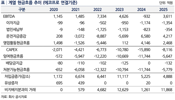 반면 같은 시기 누적 EBITDA는 1조 6000억원 수준에 그친다. 이에 그룹 내에서 유상증자, 자회사 지분 매각, 신종자본증권 발행과 함께 외부 차입을 늘려 부족한 현금 수요를 보충했다. 2022~2024년 에코프로의 연평균 잉여현금흐름 부족분은 1조 1544억원에 달한다. 지난해 잉여현금흐름 부족분은 5647억원으로 축소됐다.