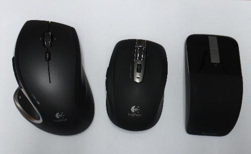 ◇왼쪽부터 로지텍의 '퍼포먼스 MX', 로지텍 '애니웨어', 마이크로소프트의 '아크 터치'.(사진=곽보연기자)