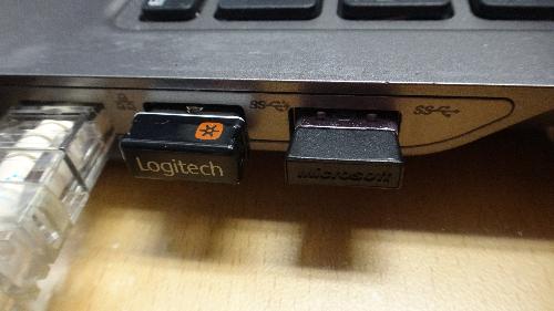 ◇로지텍의 초소형 '유니파잉(Unifying) 수신기'와 마이크로소프트(MS)의 초소형 수신기.(사진=곽보연기자)