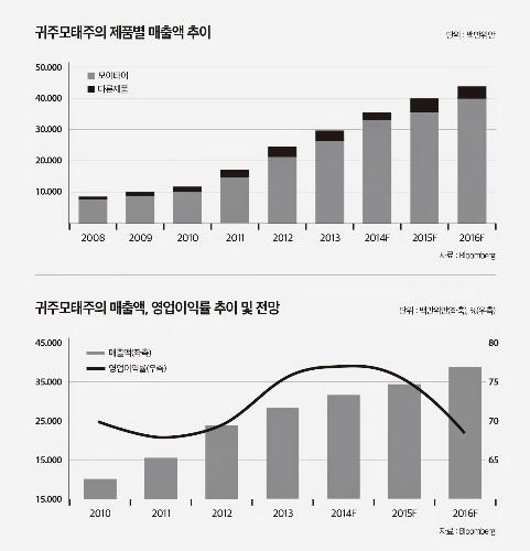 다만 대중소비가 증가하고 있고 기저효과로 인한 성장세 전환이 기대된다는 점에서 귀주모태주의 실적은 반부패 정책이 정점을 기록한 2014년에 바닥을 찍고 2015년에는 점차 회복될 것이란 전망이다. 실제로 2015년 1분기 매출액은 87.6억위안으로 전년대비 15.5%, 순이익은 43.7억위안으로 18% 증가하며 큰 폭으로 회복된 모습을 보였다.