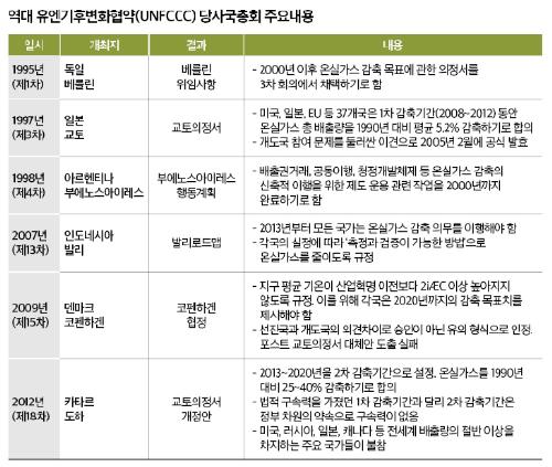 지구온난화를 유발하는 온실가스 배출을 줄이기 위한 국제 사회의 노력은 오래전에 시작됐다. 대표적인 것이 1994년 발효된 유엔기후변화협약(UNFCCC)인데, 당사국들은 기후변화협약의 구체적인 이행방안을 논의하기 위해 매년 대륙별로 돌아가며 회의(COP)를 개최한다. 온실가스의 구체적인 감축 목표를 처음으로 설정했던 '교토의정서'나 선진국과 개발도상국 모두 감축 의무를 이행하도록 규정한 '발리로드맵' 등이 당사국 총회에서 결정된 사항들이다.
