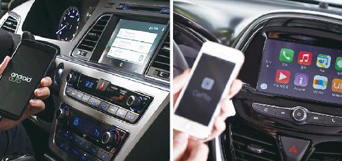 ◇구글 안드로이드 오토(왼쪽)와 애플 카플레이를 구동한 모습. (사진/뉴시스)