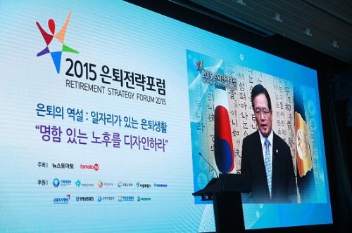 정의화 국회의장은 18일 서울 여의도 글래드호텔에서 뉴스토마토와 토마토TV가 공동 주최한 ‘2015 은퇴전략포럼’에서 축사를 통해 “저출산, 고령화시대에 우리 경제 성장동력을 계속 채워나가기 위해서는 은퇴세대를 위한 일자리 창출이 필수적”이라고 밝혔다. 사진/뉴스토마토