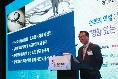 18일 서울 여의도 글래드호텔에서 열린 '2015은퇴전략포럼'에서 방하남 한국노동연구원장이 '빛나는 노후를 위한 일자리 제언'이라는 주제로 기조연설을 하고 있다.