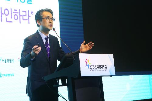 '2015은퇴전략포럼'에 참석한 홍창형 아주대 정신건강의학과 교수가 '치매사회 생존법‥커밍아웃'이란 주제로 특별강연을 하고 있다. 사진/뉴스토마토