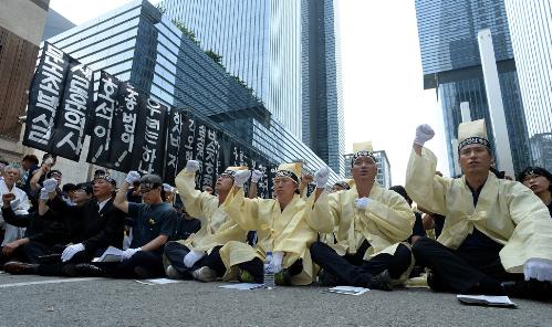 ◇2014년 6월30일 삼성전자서비스지회 소속 노동자들이 서울 서초동 삼성전자 본사 앞에서 고인이 된 동료 서비스 기사 염호석씨의 영결식을 진행하고 있다. 사진/뉴시스