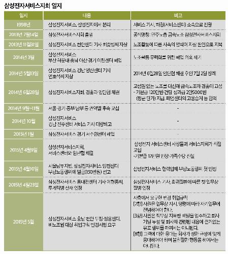 지난 2013년 7월14일 간접고용의 폐해에 시달리는 서비스 기사들은 희망을 봤다. 무노조 경영의 대명사로 꼽히는 삼성에서, 그것도 서비스 기사들이 노조를 출범시켜 처우 개선을 요구하고 나섰기 때문이다. 삼성전자서비스지회는 삼성전자 서비스센터에서 일하는 기사들이 결성한 노조로, 서비스 기사 두 명의 희생을 기반으로 일어섰다.