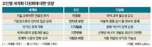 세계화와 다원화는 어느 쪽이 옳고 그른지를 판단해 한 가지만을 선택해야 하는 문제가 아니다. 때문에 세계화 혹은 다원화를 위해 특별한 노력을 기울일 필요도 없다. 기술의 발전과 환경의 변화에 따라 각 국이 처한 환경은 달라질 수 밖에 없는데, 세계화의 수준도 여기에 맞춰 달라진다. 기술 진보의 결과도 예단하기는 어렵다. 때로는 세계화를 촉진할 것으로 기대됐던 요인이 이를 가로막는 장애물이 되기도 하고, 반대로 걸림도로 여겨졌던 것이 지구촌의 울타리를 낮추는 촉매제가 되기도 한다. 이와 관련 크레딧스위스가 최근 발간한 '세계화의 종말인가, 더 다극화된 세계인가'란 제목의 보고서는 우리의 앞날을 가늠하는데 도움이 될 만한 시사점을 제공한다.