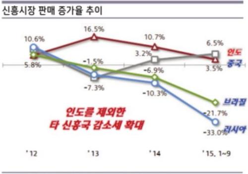 글로벌 자동차 업체들의 격전지인 중국과 브라질, 러시아는 최근 몇 년간 자동차 시장 성장이 둔화되고 있다. 중국은 지난 1월 7.8%의 판매 증가율을 기록한 이후 2~5월에 성장세가 급격히 둔화됐다. 6월 0.3%의 판매 감소를 기록한 중국은 8월까지 3개월 연속 자동차 판매가 줄었다. 브라질은 2012년부터 감소 추세가 지속되고 있고, 러시아도 2013년부터 판매가 줄기 시작해 올 1~10월 판매는 전년 동기 대비 33.6% 감소했다.