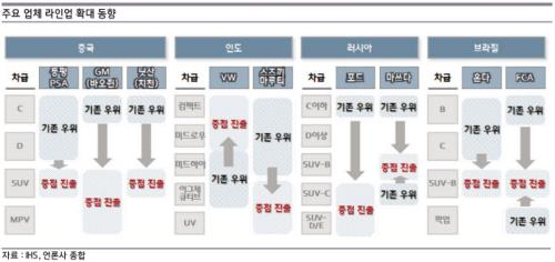 이상우 주임연구원은 “신흥시장의 환경 및 주요 업체 제품 전략 변화가 급격하게 일어나고 있어 국내 업체의 현지에서의 위치가 위협받고 있다”며 “과거 적극적 신차 투입과 빠른 교체 주기를 통해 확보했던 국내업체의 제품 경쟁력 우위가 최근 들어 약화되고 있어 성장 차급에 대한 신속한 라인업 확대와 상품성 강화 등의 대책이 시급하다”고 말했다.