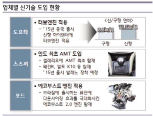 규제 충족을 위해 글로벌 업체들은 선진시장에 우선 적용했던 엔진 다운사이징이나 변속기 관련 신기술을 신흥시장에도 동시에 적용하기 시작했다. 토요타는 중국에 출시한 2015년형 ‘하이랜더’에 2.0리터 터보 엔진을 장착해 연비를 기존 8.8km/L에서 11.5km/L로 개선했다. 포드도 브라질에 출시한 퓨전에 2.0리터 티타늄 에코부스트 엔진을 탑재해 동급 경쟁 모델 대비 고연비인 7.8km/L를 달성하고 주행성능도 대폭 개선했다.