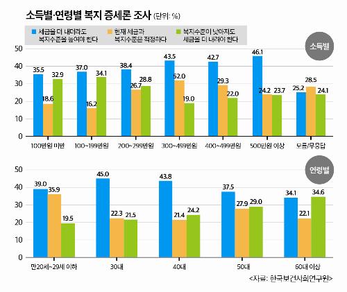 흥미로운 점은 이 같은 정서가 정부와 경제계의 반복지 논리를 그대로 답습하고 있다는 점이다. 특히 복지정책의 수혜 대상인 사회 취약계층일수록 공감도가 크다. 보건사회연구원 조사를 보면, 복지 증세를 반대하는 연령은 60대가 34.6%로 가장 높았으며, 소득수준에서는 월 소득 100~199만원(34.1%), 100만원 미만(32.9%) 순으로 높았다. 반면 소득수준이 월 300만원을 넘는 경우 복지를 위한 증세론에 찬성하는 경향이 강했다.
