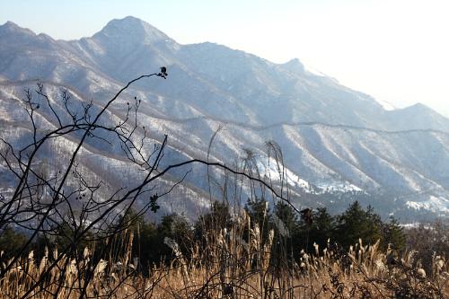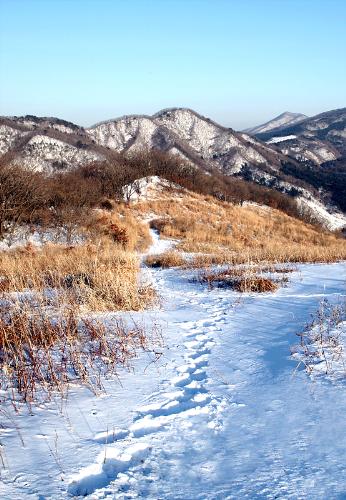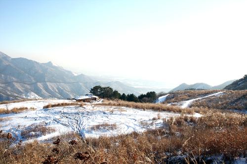 눈이 쌓인 울창한 숲길을 따라 20여분 남짓 오르면 다소 가파른 산비탈이 나타난다. 그렇게 순한 길과 조금은 가파른 길을 몇 차례 지나 8부능선 쯤에 이르면 어느 순간 시야가 확 트인다. 넓게 펼쳐진 초원지대와 산 아래 전망은 한없이 아름답다. 눈이 그려낸 엷은 채색의 풍경은 한 폭의 수묵화와 다름 아니다. 멀리 산풍경은 흑백의 윤곽선을 연하게 두르며 산세를 도드라지게 그려낸다. 하단 등성이를 채우는 것은 황금빛의 억새들판이다. 산길을 오르는 산행객의 실루엣 역시 멋진 풍경을 살아나게 하는 하나의 오브제다. 하늘 아래 넓게 펼쳐진 초원의 풍광은 광막하고도 평화롭다. 그 들판에 오롯이 자리한 초가 하나와 길을 걷는 사람은 그대로 오브제가 되어 하나로 어우러진 풍경을 빚어낸다.
