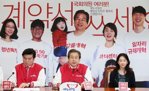 새누리당 최고위원들이 14일 모두 같은 점퍼를 입고 한자리에 앉았다. 공식 선거운동복이다. 총선 한달 전인 이날을 선거캠페인 시작일로 삼은 것이다. 그동안 침묵을 이어오던 김무성 대표도 이날 총선 5대 공약(갑을개혁, 마더센터, 일자리 규제개혁, 4050 자유학기제, 청년독립)을 설명하며 3주만에 입을 열었다.